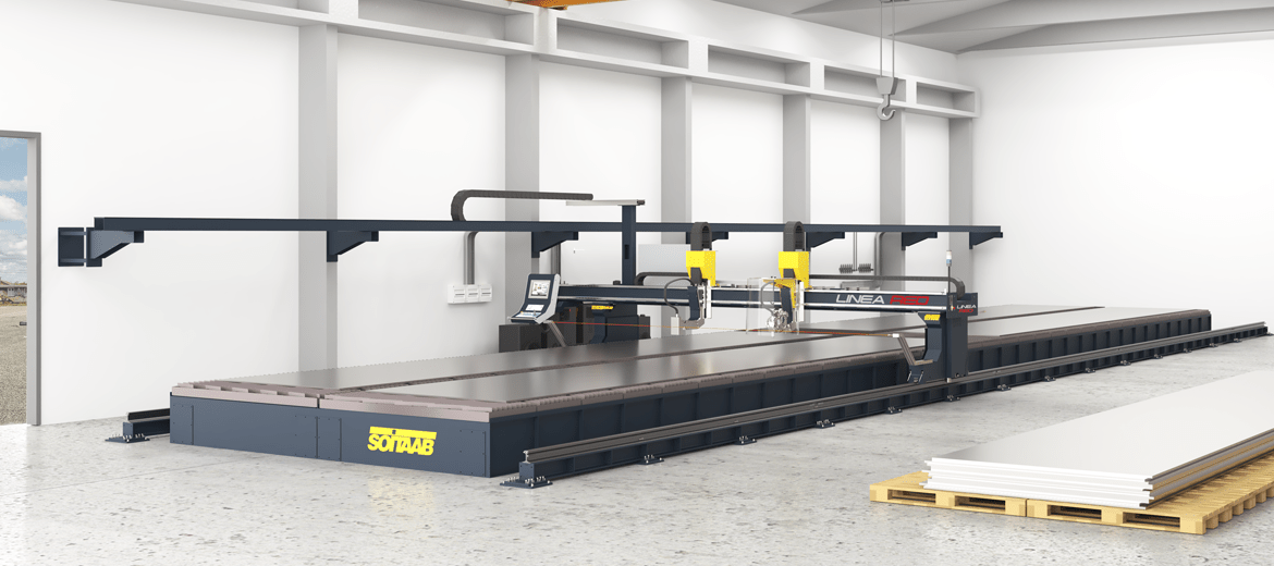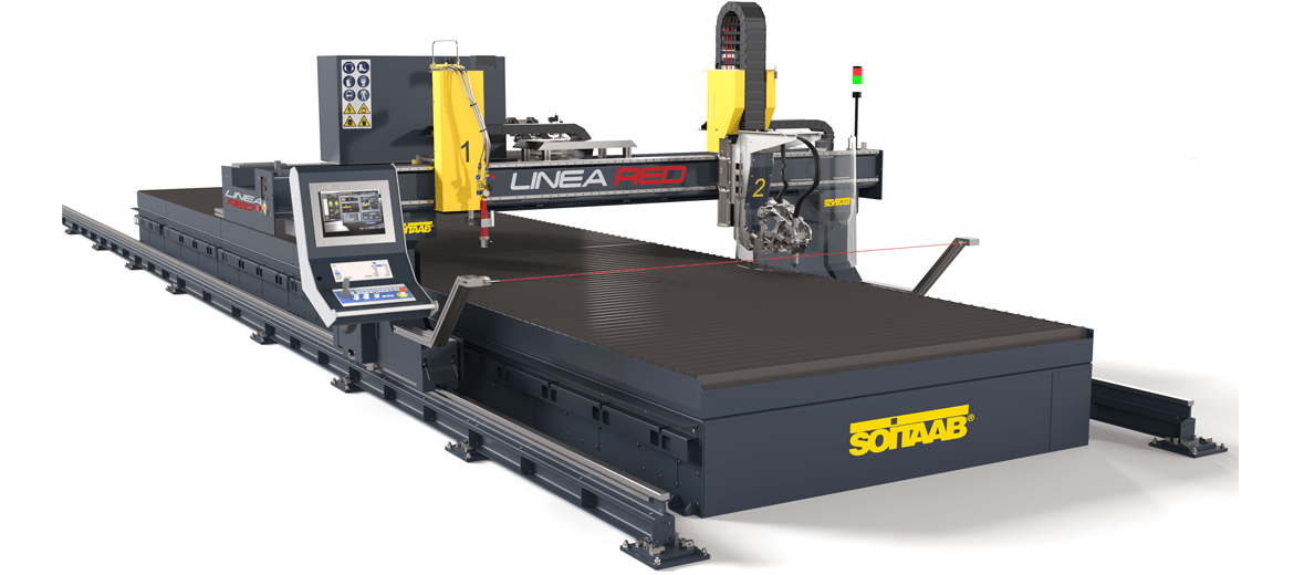 LineaTech RED offers various possibilities for applications such as flame cutting, plasma cutting, marking and pre-drilling mechanical device. LineaTech RED is a longitudinal twin motors with brushless motors and digital drives in absolute coordinates. The movement is achieved by mating rack and pinion and floating device and preloaded spring.
