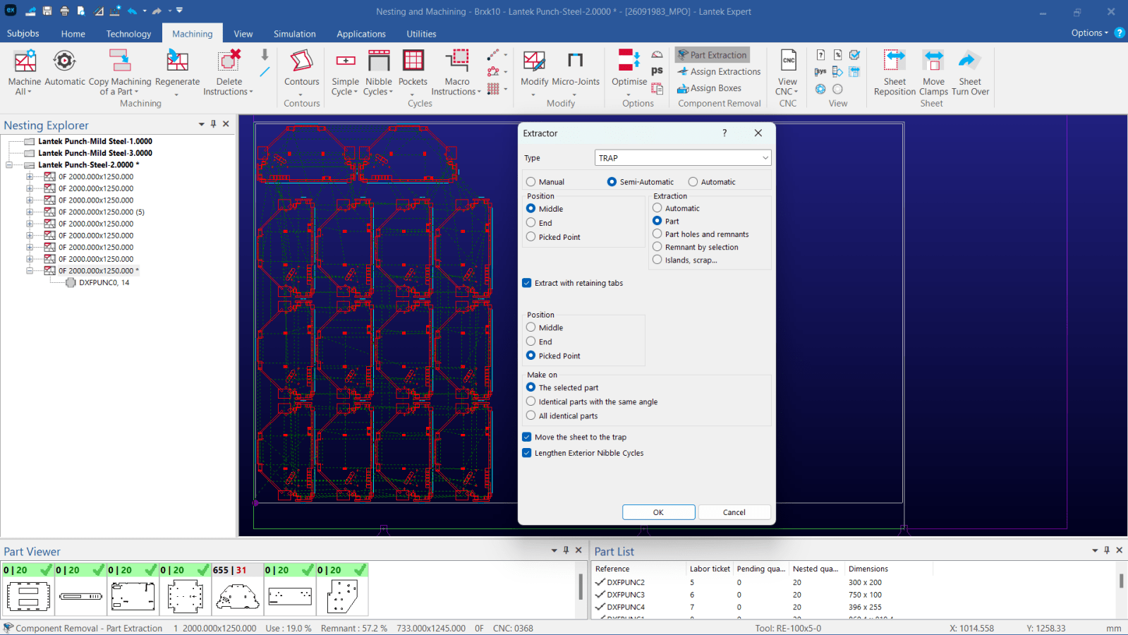 Lantek Expert Punch offers automatic and manual nesting with great flexibility and optimum performance. The combination of automatic nesting, along with manual nesting functions such as grid copying, moving, and rotating, proves to be a very powerful tool.Lantek Expert Punch automatic nesting optimizes part arrangement on the sheet, offering different options for common punching on regular and irregular parts.