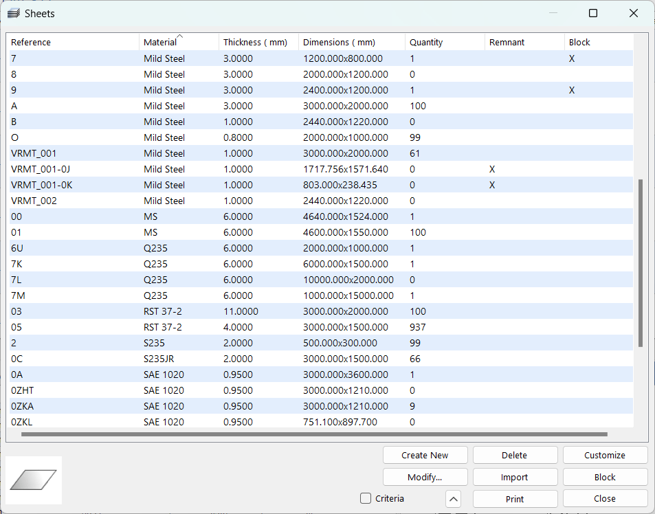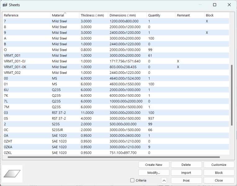 - Open Database – This database is open and enables the user to access it to find parts, manufacturing orders, plates, etc. by using criteria such as: material, thickness, client, date, etc.
