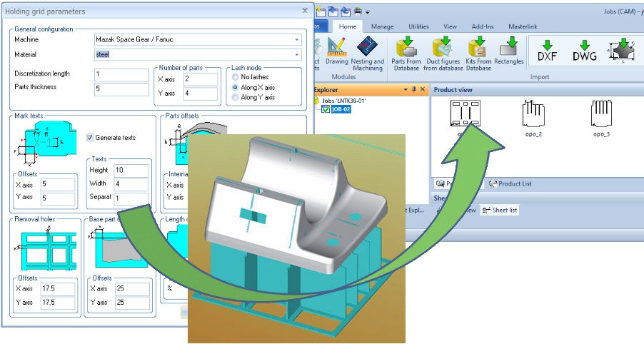 Lantek Flex3D 5x automatically generates the fixtures necessary for positioning the part correctly on the machine table. Taking as a base the desired position and height of the part above the cutting table, the system provides a user-modifiable holding grid, where the user can decide how many fixtures will hold the part in place and their locations.When the appropriate holding grid has been designed, Lantek Flex3D 5x generates the solids necessary for positioning the part on the table. Automatic fixture calculation takes cutting contours into account, so that the calculated fixtures do not interfere with either the cutting head or any of the holes to be cut. This saves valuable machine time, normally associated with program verification in the machine.